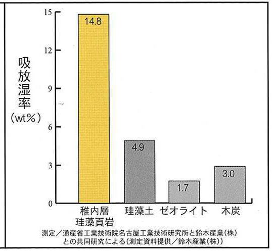 この岩は。珪藻が変質した数ミクロンの微細な針状結晶が集合した(まりも状)の微粒で構成されていて、吸放湿に有効な細孔とその容量が多いため、一般的な珪藻土より、3倍以上の吸放湿機能を発揮する特性をもっています。